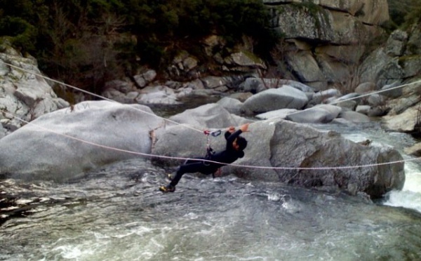 Ou travaux accros en rivière La saison canyon n'a pas encore commencé mais la combis est déja necessaire pour traverser le Rizzanese.