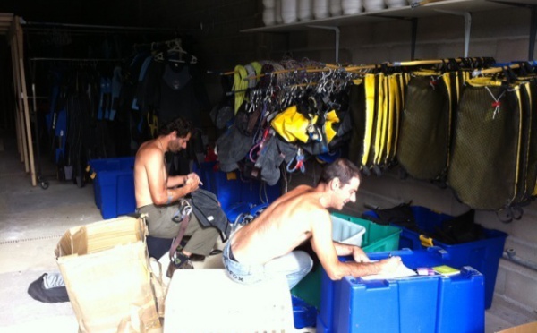 Cedric et Bertrand le nez dans les EPI Bertrand, Sylvain, Paul, Cedric et Manu toute l'équipe masculine de Couleur Corse au local matos pour classer, réparer, archiver, ranger....